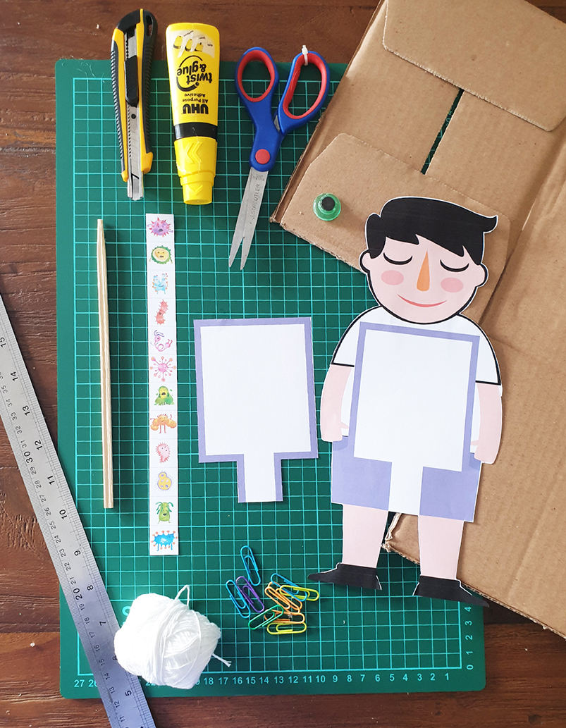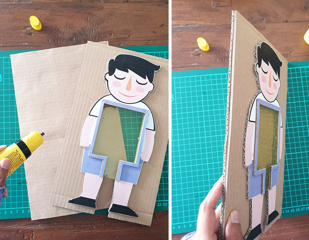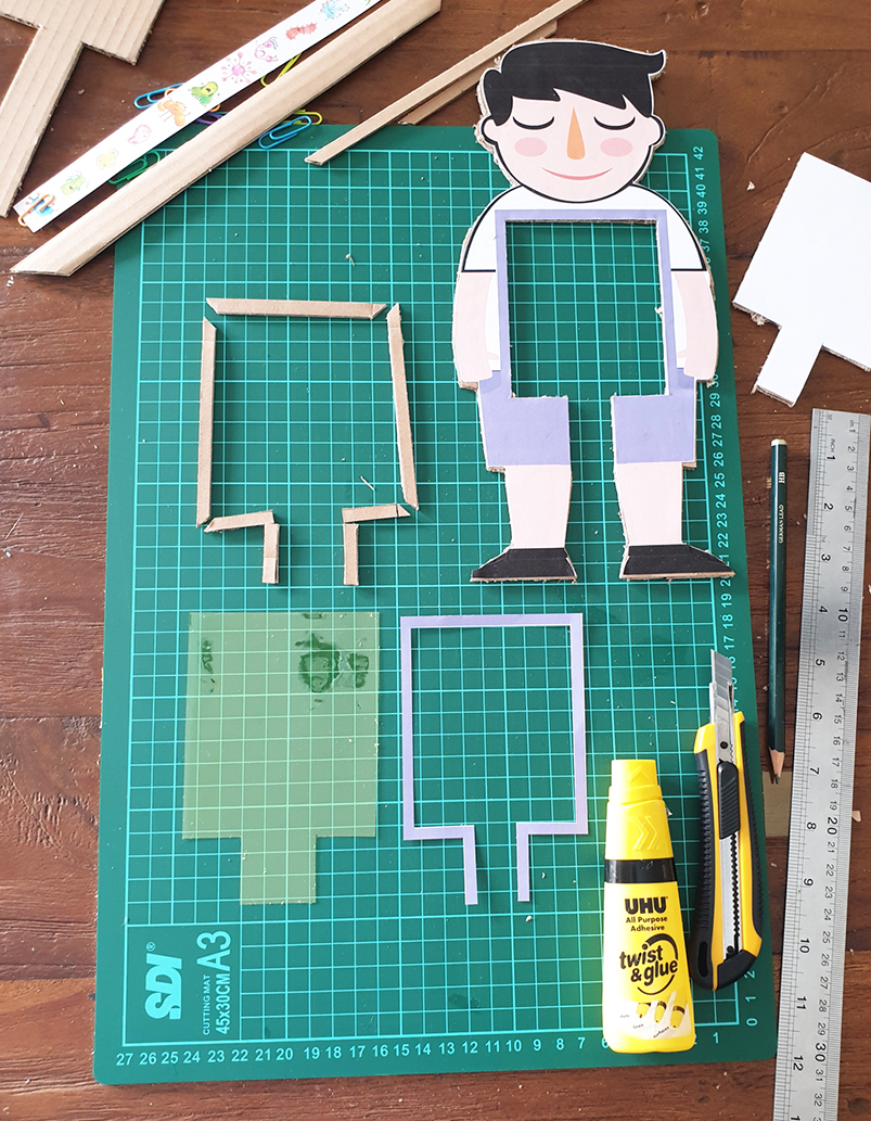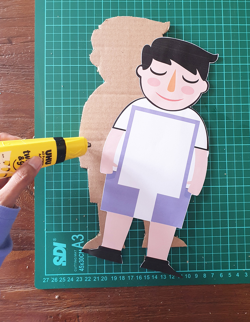 2. gunting dan tempel printable gambar anak di atas kardus, lalu potong kardus mengikuti bentuk gambar anak.
