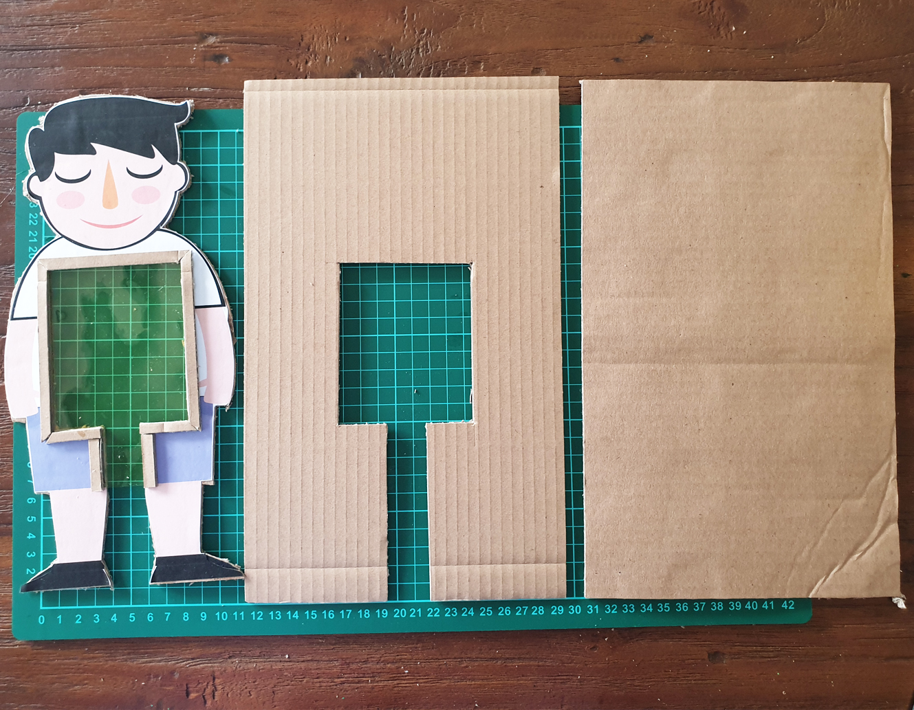 3. lubangi kotak putih di tengah gambar anak, lalu potong 2 potong kardus ukuran 0.5cm x 21cm seperti gambar di bawah.