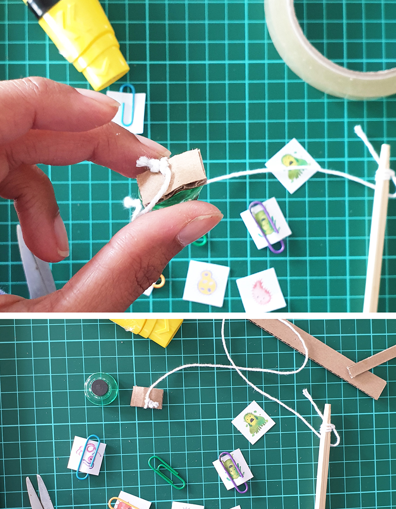 8. Siapkan potongan kardus kecil yang dilubangi untuk dimasukkan benang kasur/ wol seperti gambar di bawah, lalu tempel di atas magnet