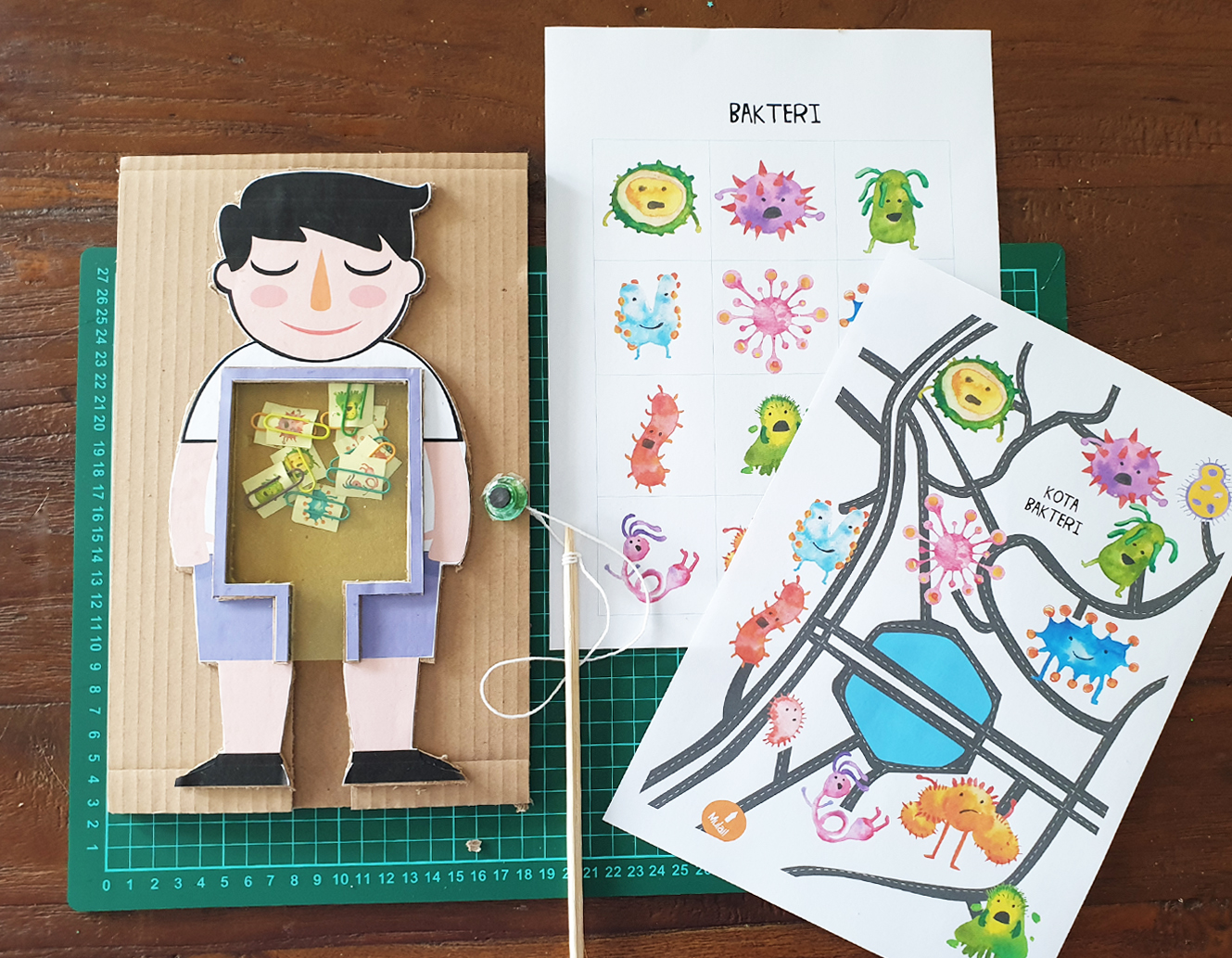 Selanjutnya anak bisa mencocokan jenis-jenis bakteri yang sudah dipancing dengan bakteri yang ada di printable. Setelah itu, ajak untuk mengembalikan bakteri-bakteri jahat ke asalnya (kota bakteri) dengan mengikuti peta di Kota Bakteri.
