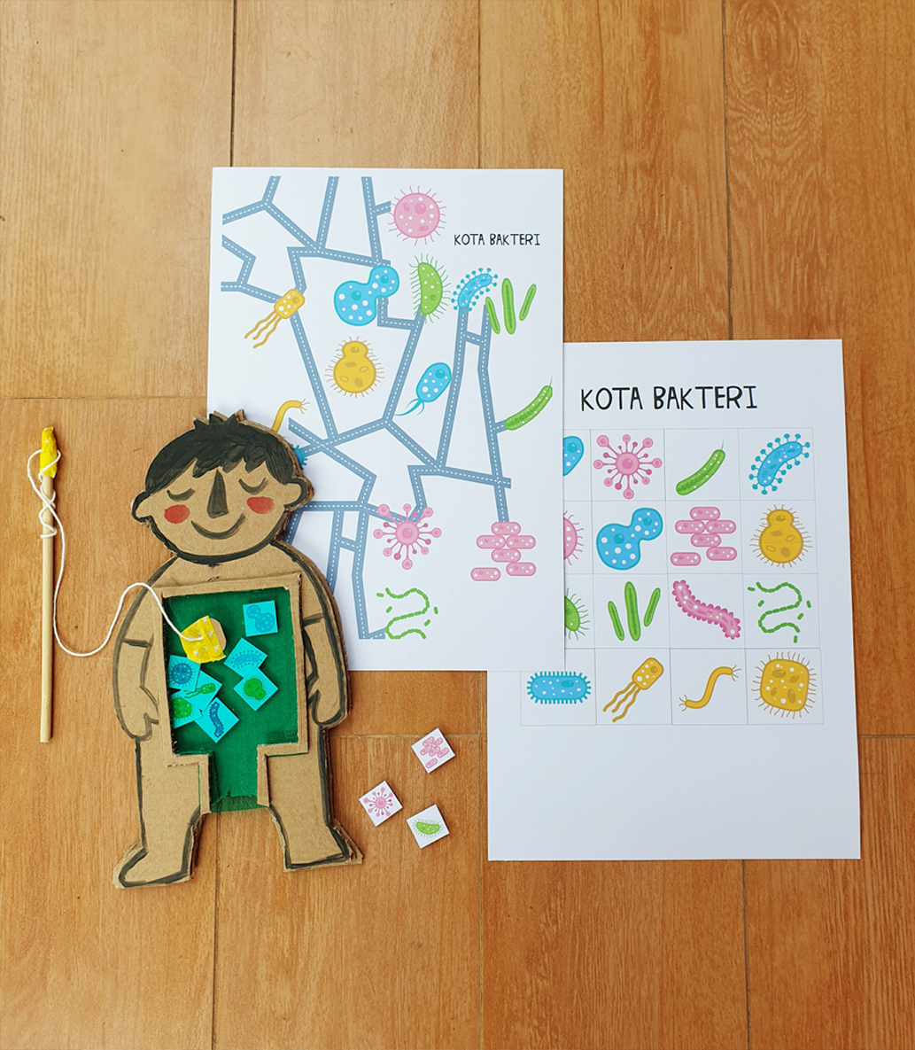 Ajak anak mengeluarkan bakteri dari dalam tubuh kardus bergambar anak sembari diceritakan bahwa mereka tengah mengeluarkan bakteri jahat dari dalam tubuh. Ayah dan bunda juga bisa menyelipkan informasi bagaimana bakteri baik melawan bakteri jahat dan dari mana saja asal kedua bakteri tersebut. misal: bakteri baik berasal dari makanan sehat, alam, dll. sedangkan bakteri jahat berasal dari makanan yang tidak bersih, tangan yang lupa di cuci, dll.